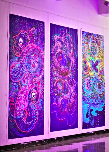 Soul Tryptic is a highly colorful and definitively large piece measuring 8′ by 4′. The sheer size of the piece allows the viewer to become engulfed in it. Browne also chose to use ultraviolet paint and plans to show the exhibit in its own dark area with flashlights to allow for an even more immersive experience for the audience. There are many small strokes and intricacies in the painting that encourage one to look closer at every detail, while the longer flowing lines guide your eyes on a journey through the paintings.